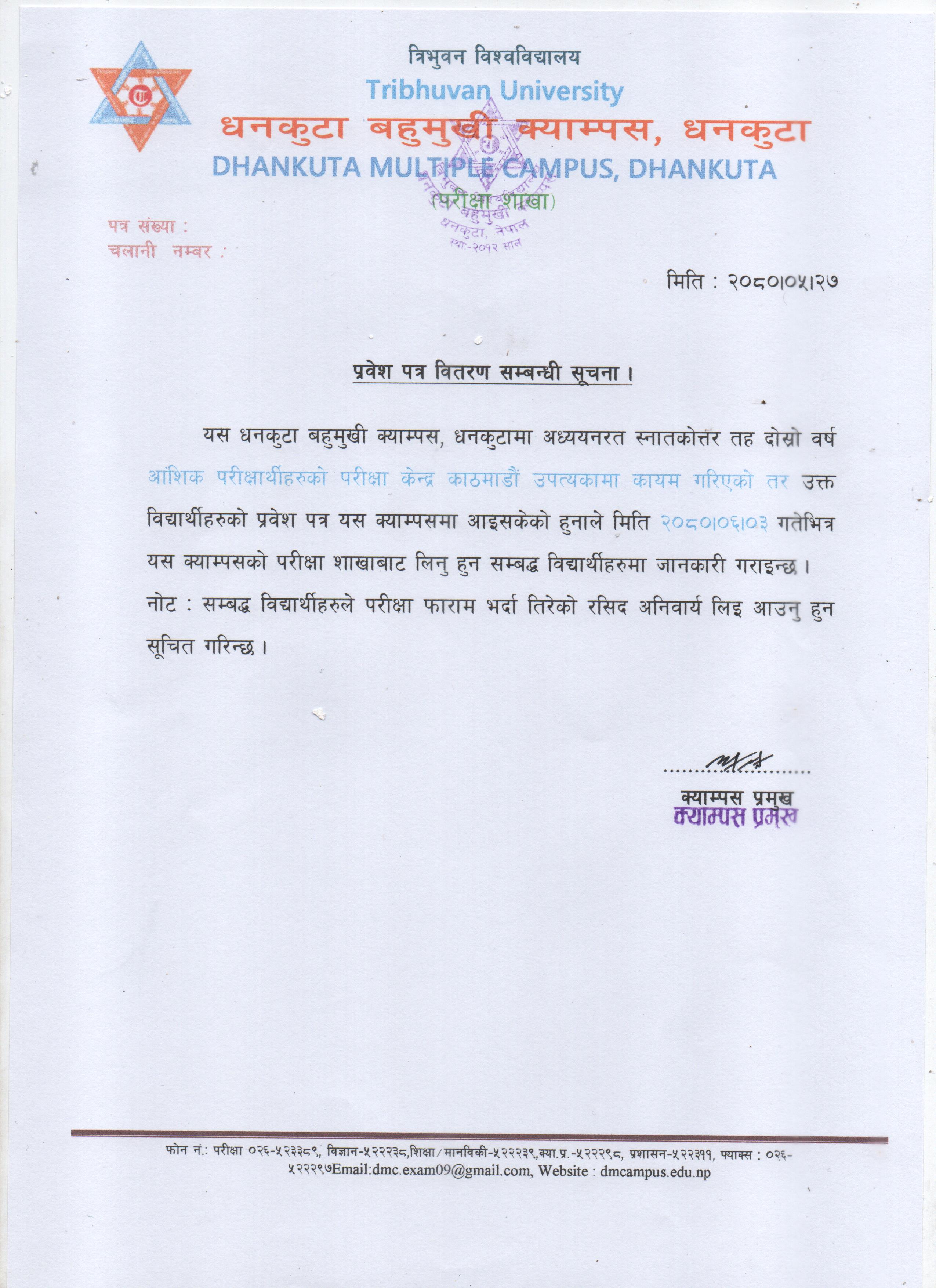 प्रवेश पत्र वितरण सम्बन्धमा ।