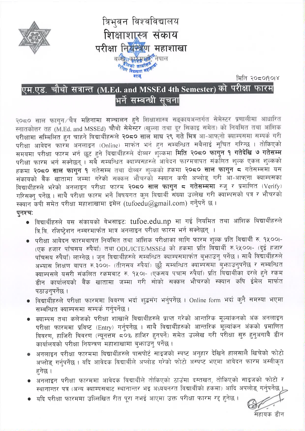 M.ed. 4th Semester Examination Form Notice