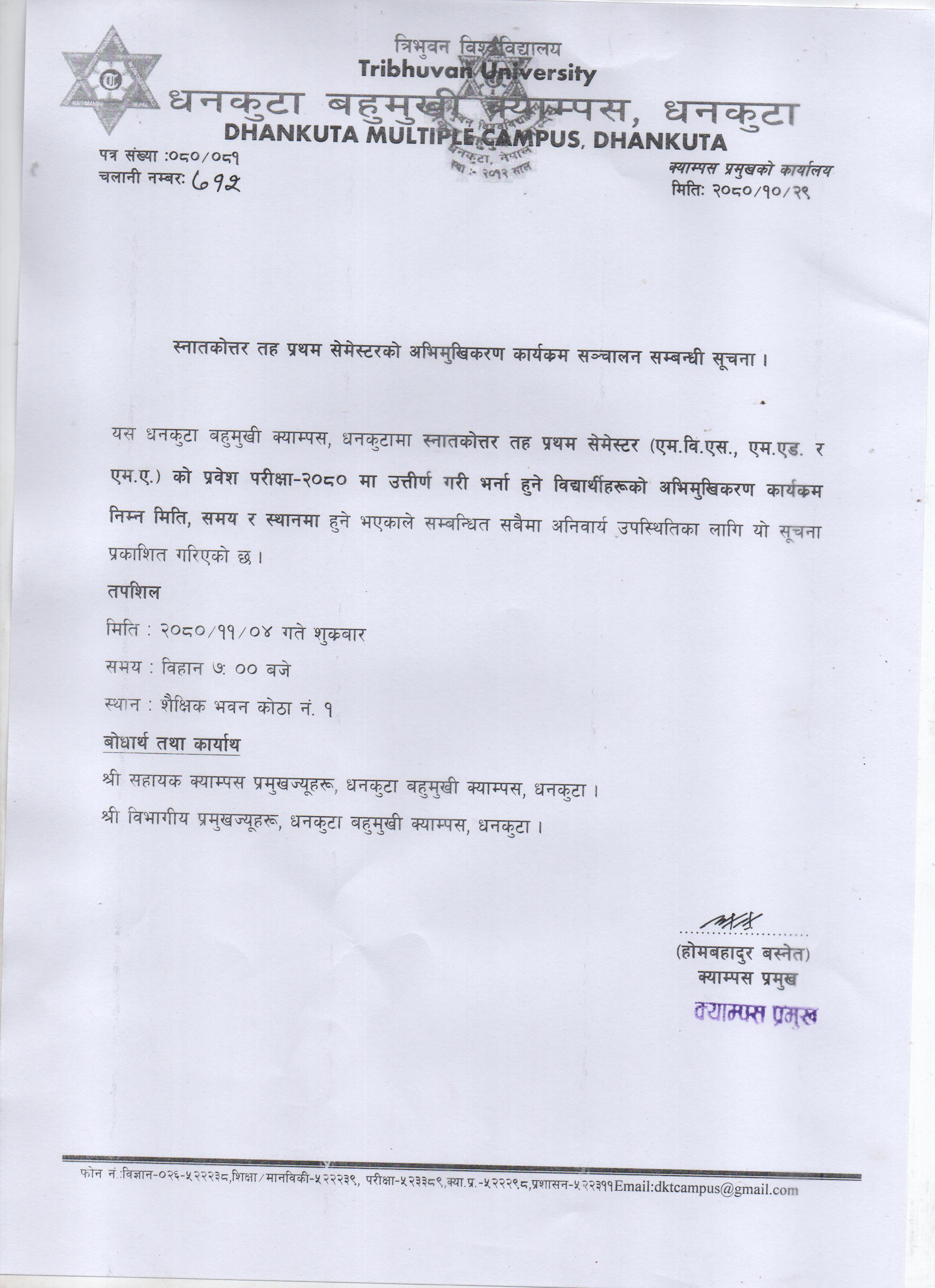 स्नातकाेत्तर तह प्रथम सेमेष्टरकाे अभिमुखीकरण कार्यक्रम सन्चालन सम्बन्धी सूचना ।