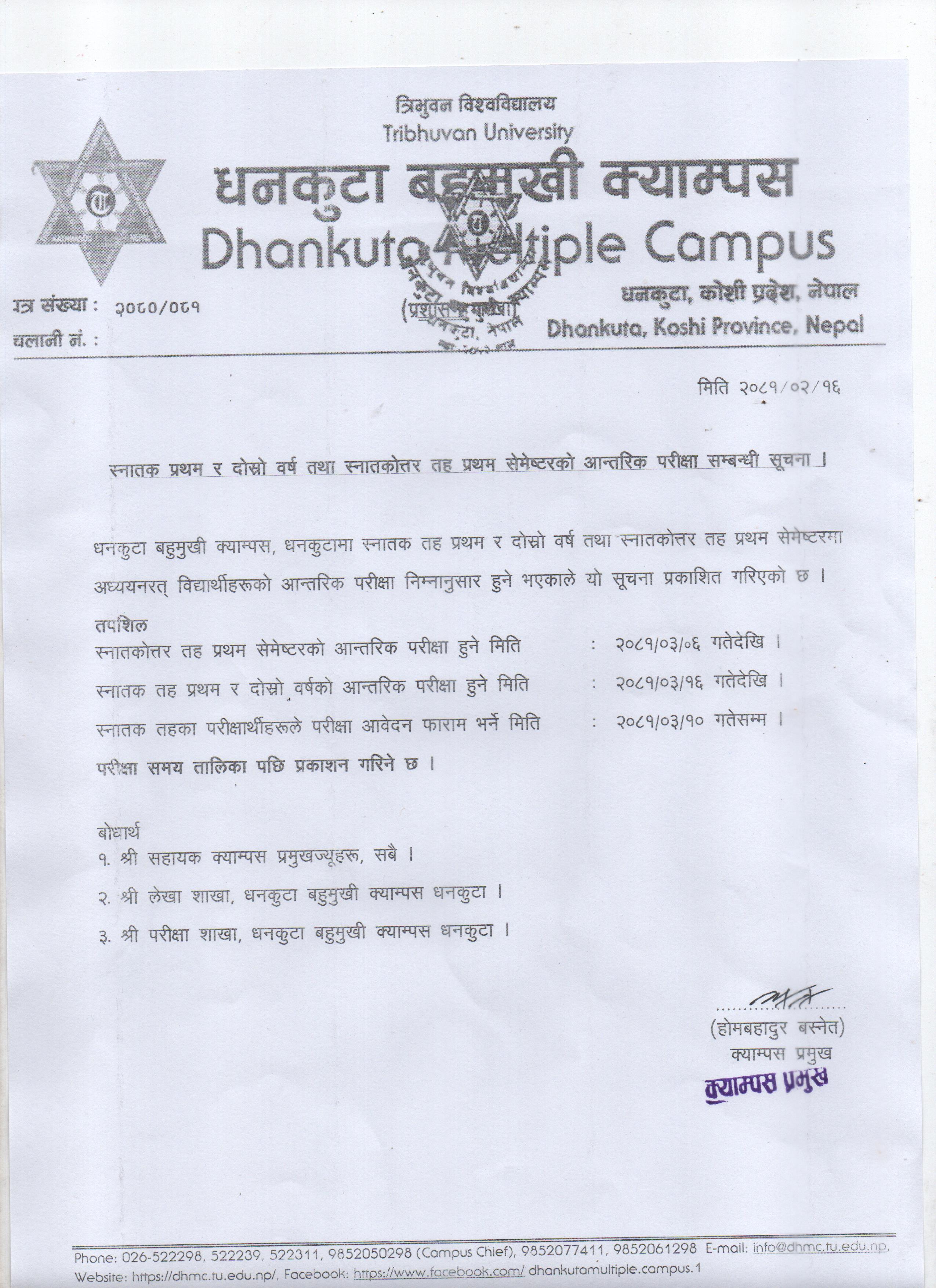 स्नातक तह प्रथम र दाेस्राे वर्ष तथा स्नातकाेत्तर तह प्रथम सेमेष्टरकाे आन्तरिक परीक्षा सम्बन्धी सूचना ।