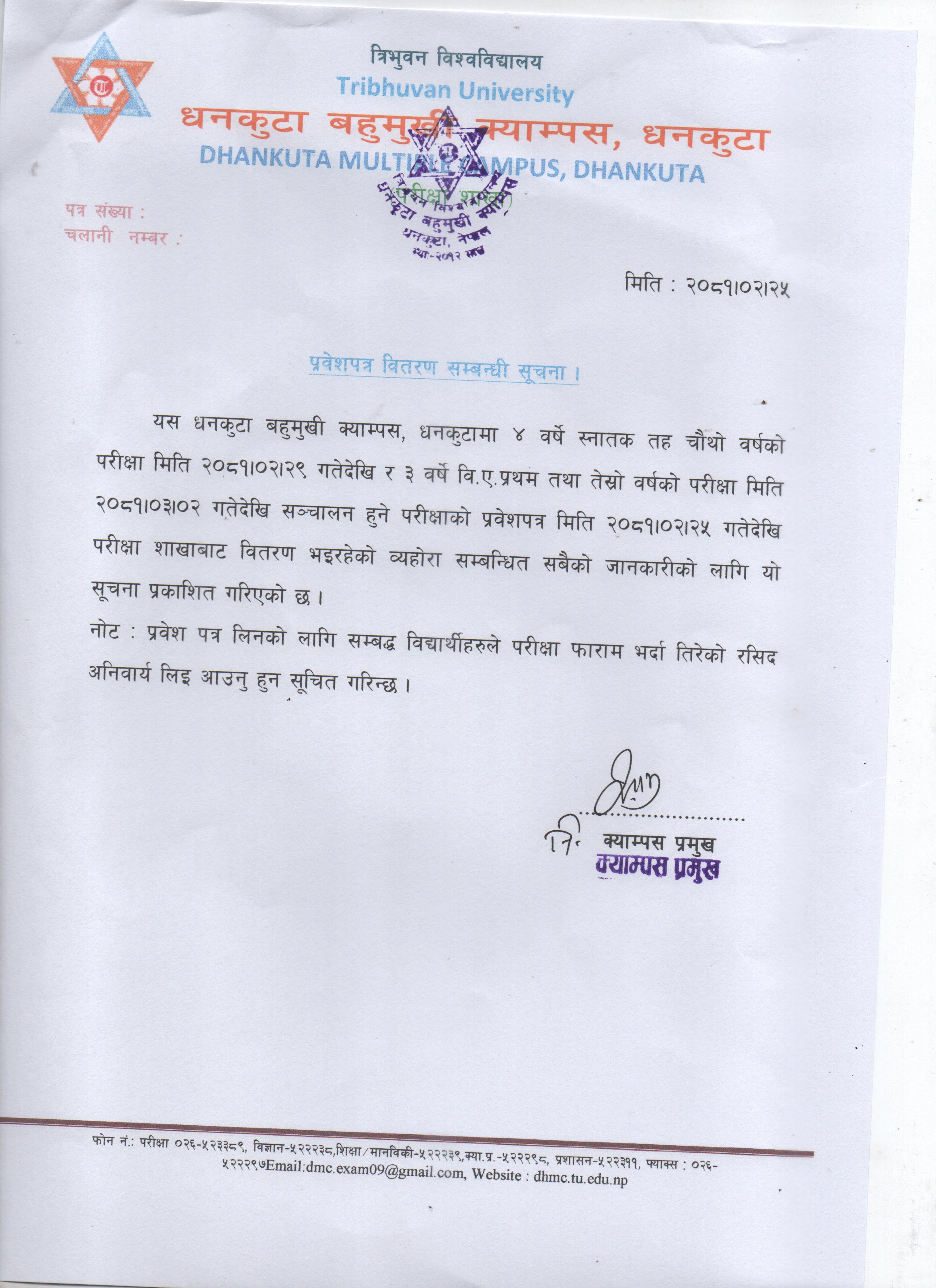 प्रवेश पत्र वितरण सम्बन्धी सूचना ।