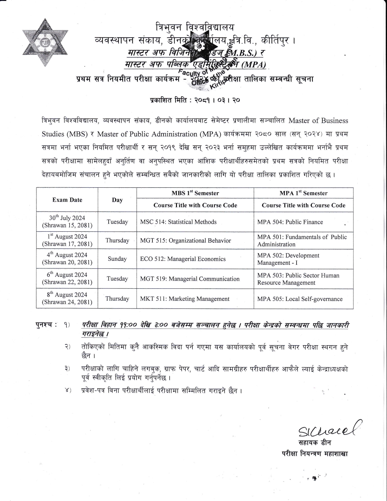 MBS 1Semester Examintion Schedule