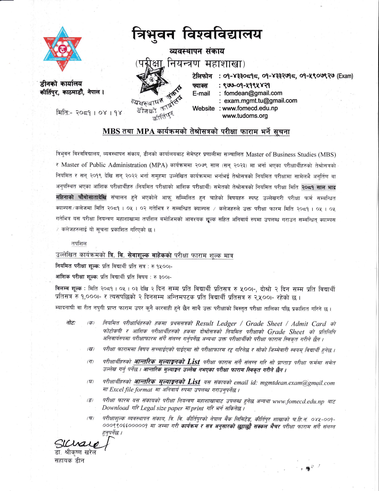 MBS 3rd Semester Examination Form Notice