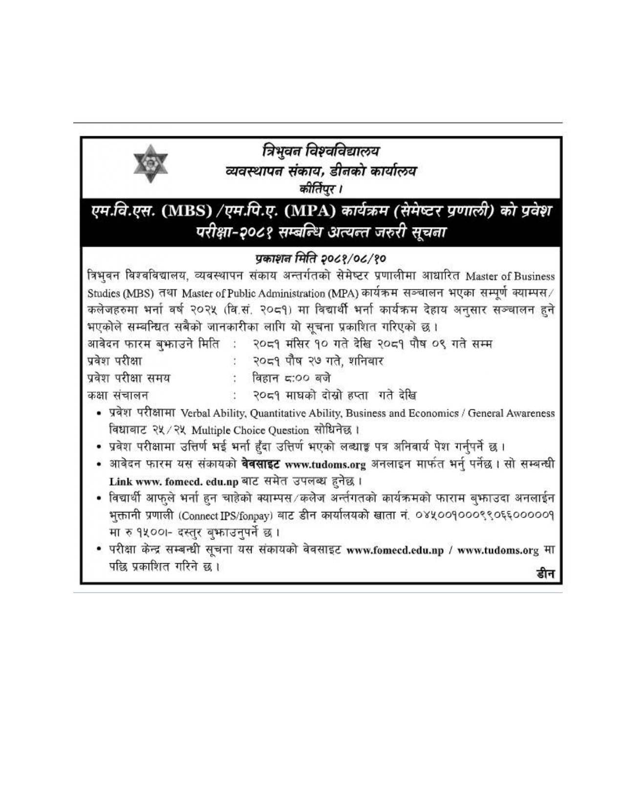 MBS Admission test date Notice