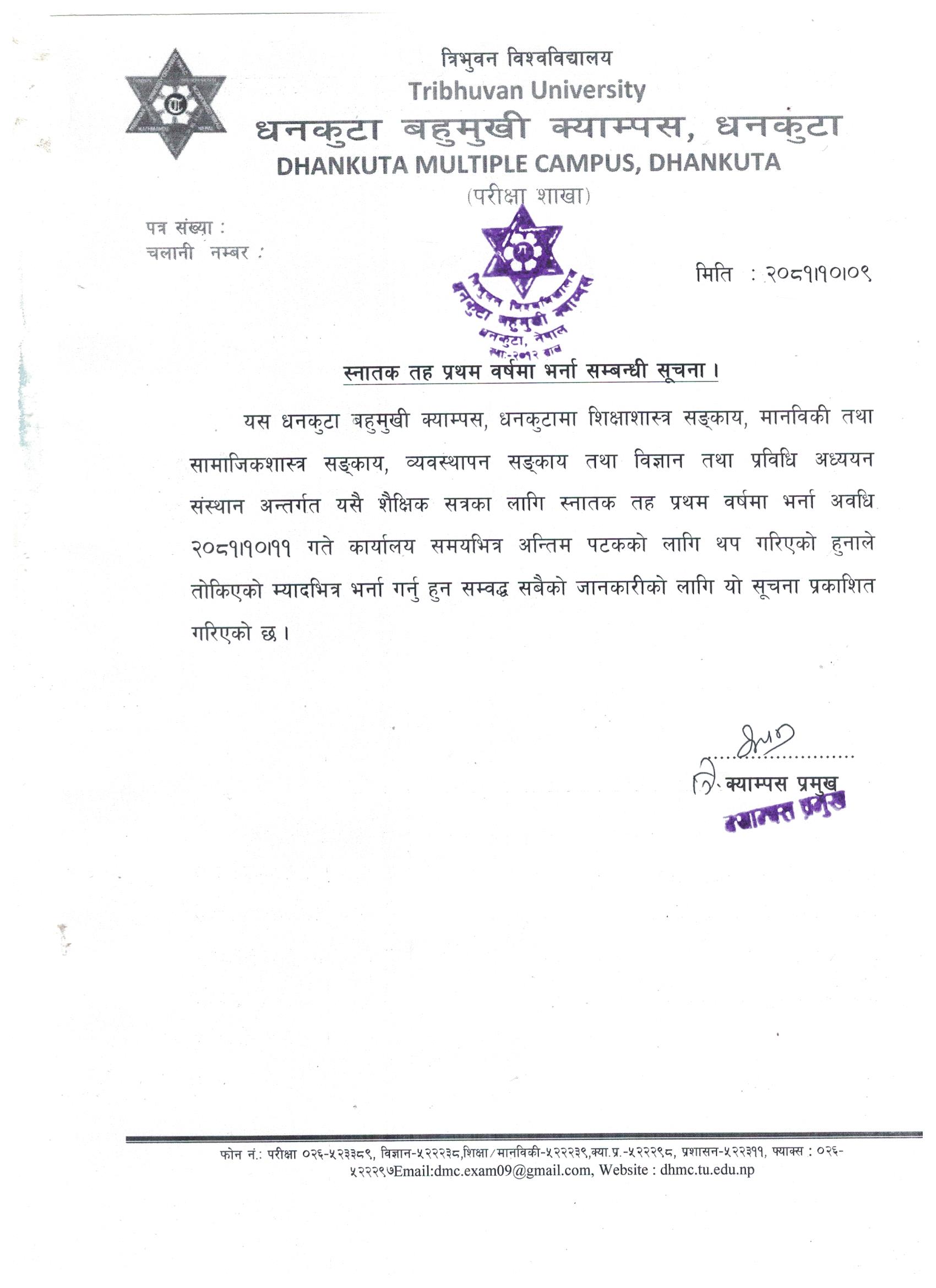 स्नातक तह प्रथम वर्षमा भर्ना सम्बन्धी सूचना ।