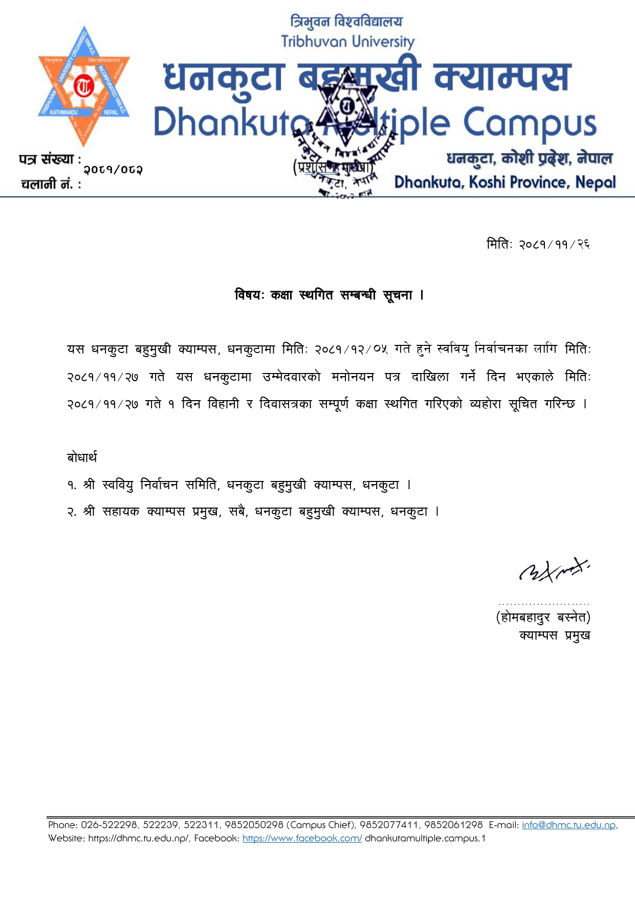 कक्षा स्थगित गरिएकाे सम्बन्धमा ।