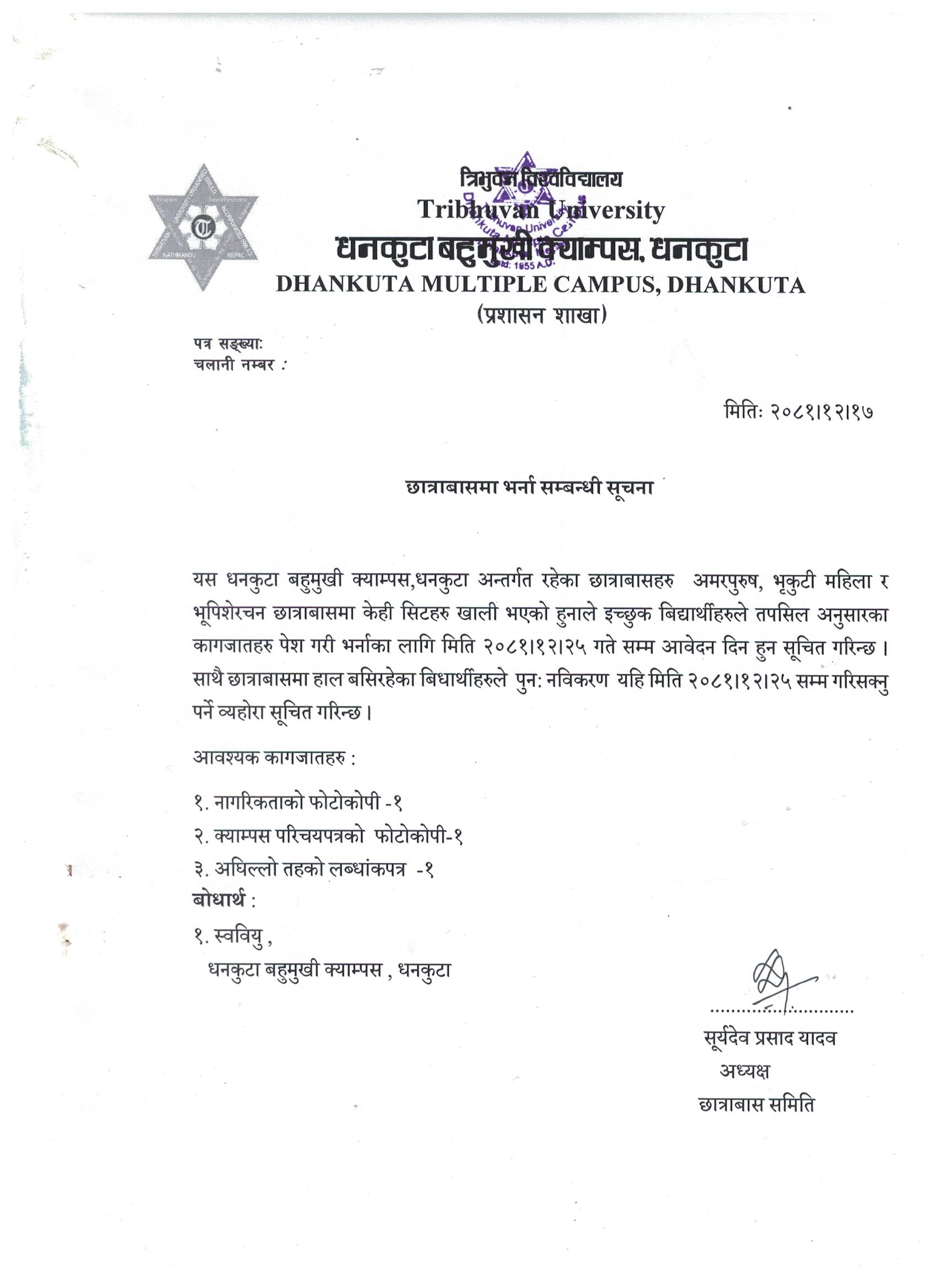 छात्रावासमा भर्ना सम्बन्धी सूचना ।