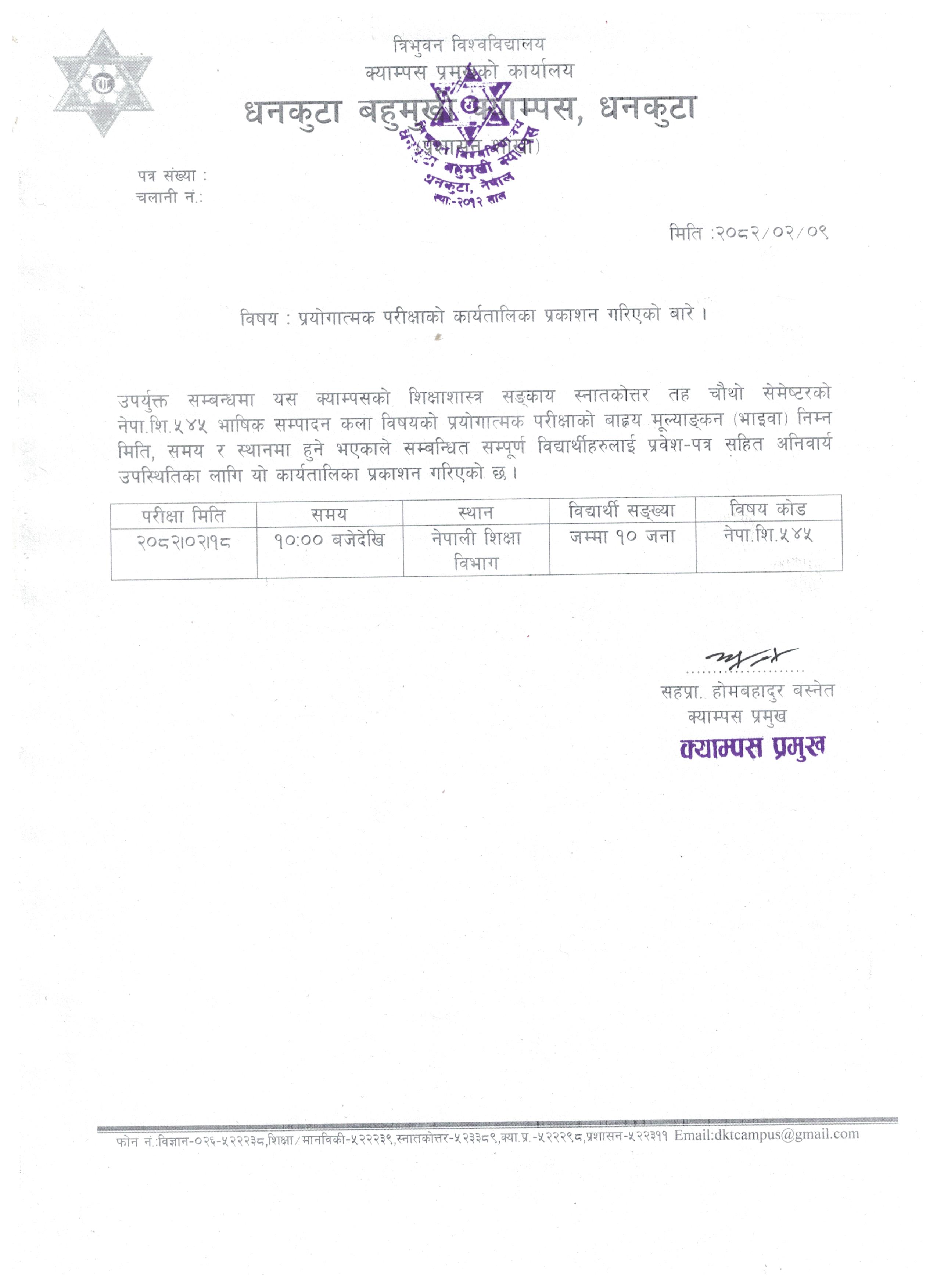 प्रयाेगात्मक परीक्षाकाे कार्यतालिका सम्बन्धमा