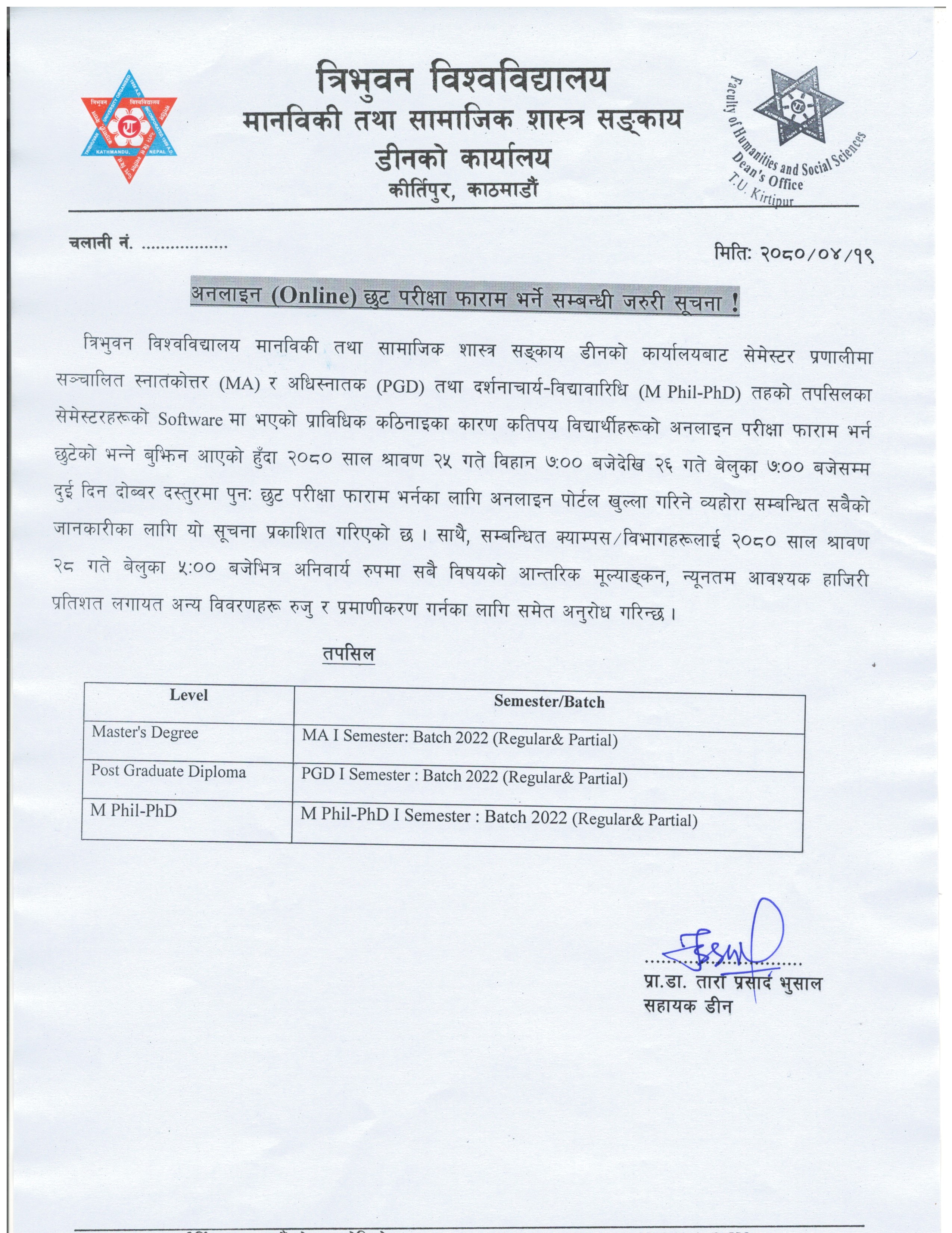 MA First Semester Examination Form Date Extended
