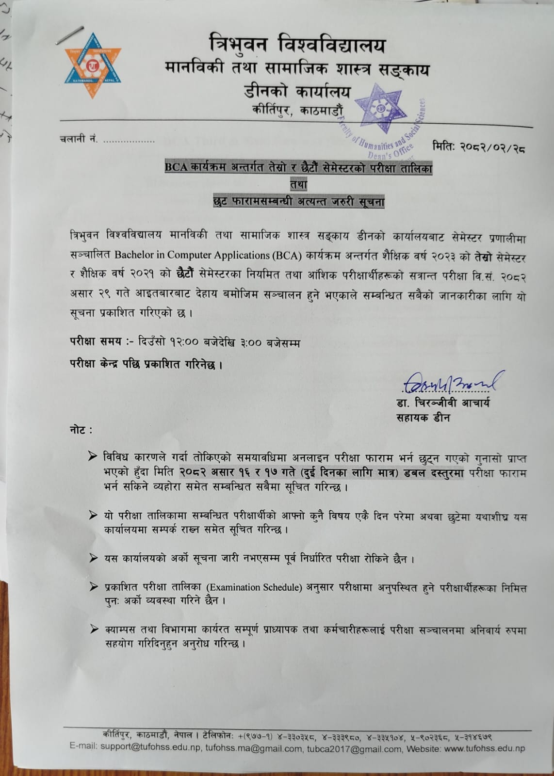 BCA 6th Semester Examination Schedule
