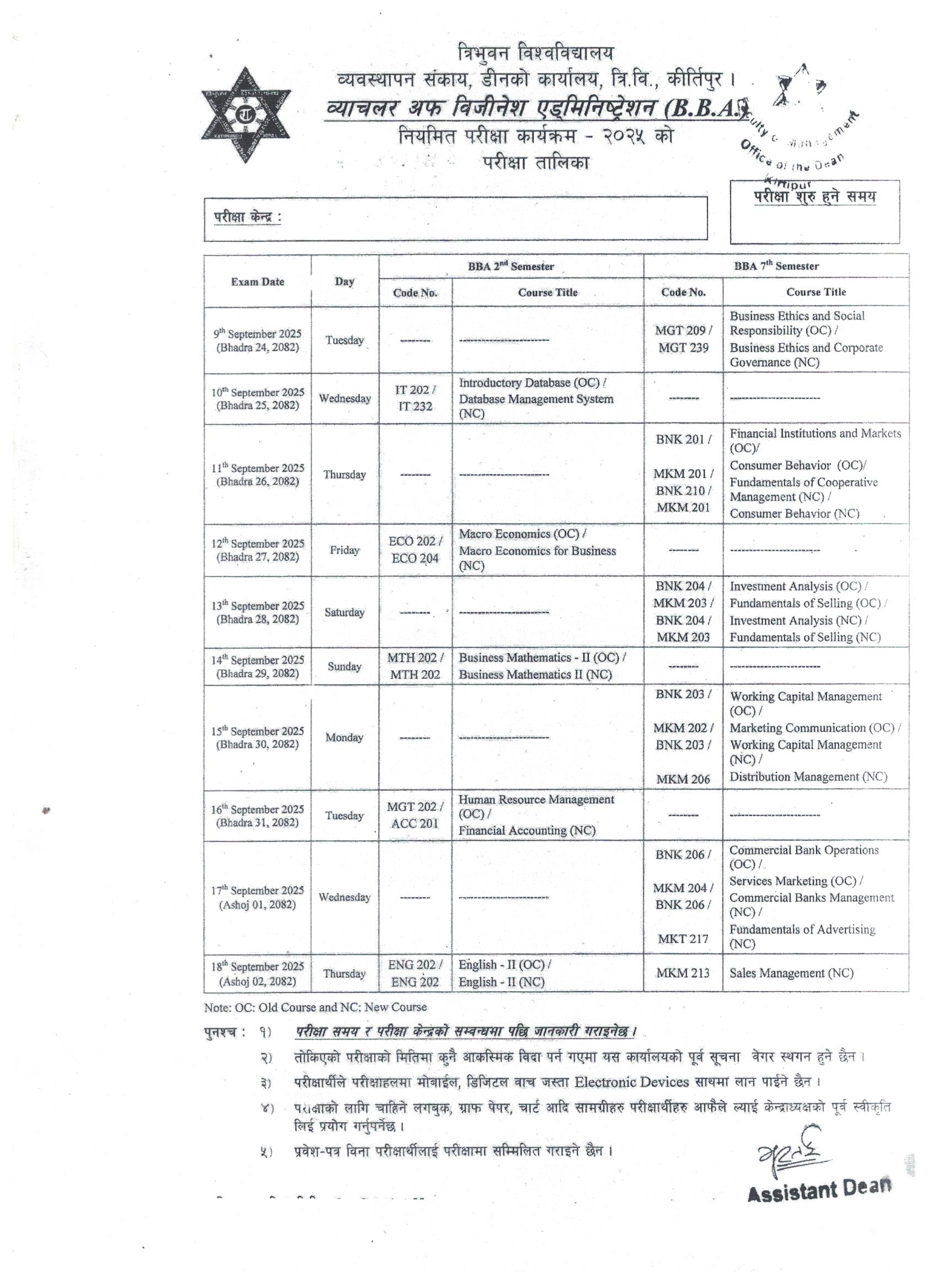 BBA 2nd And 7th Sem. Exam Schedule 2025