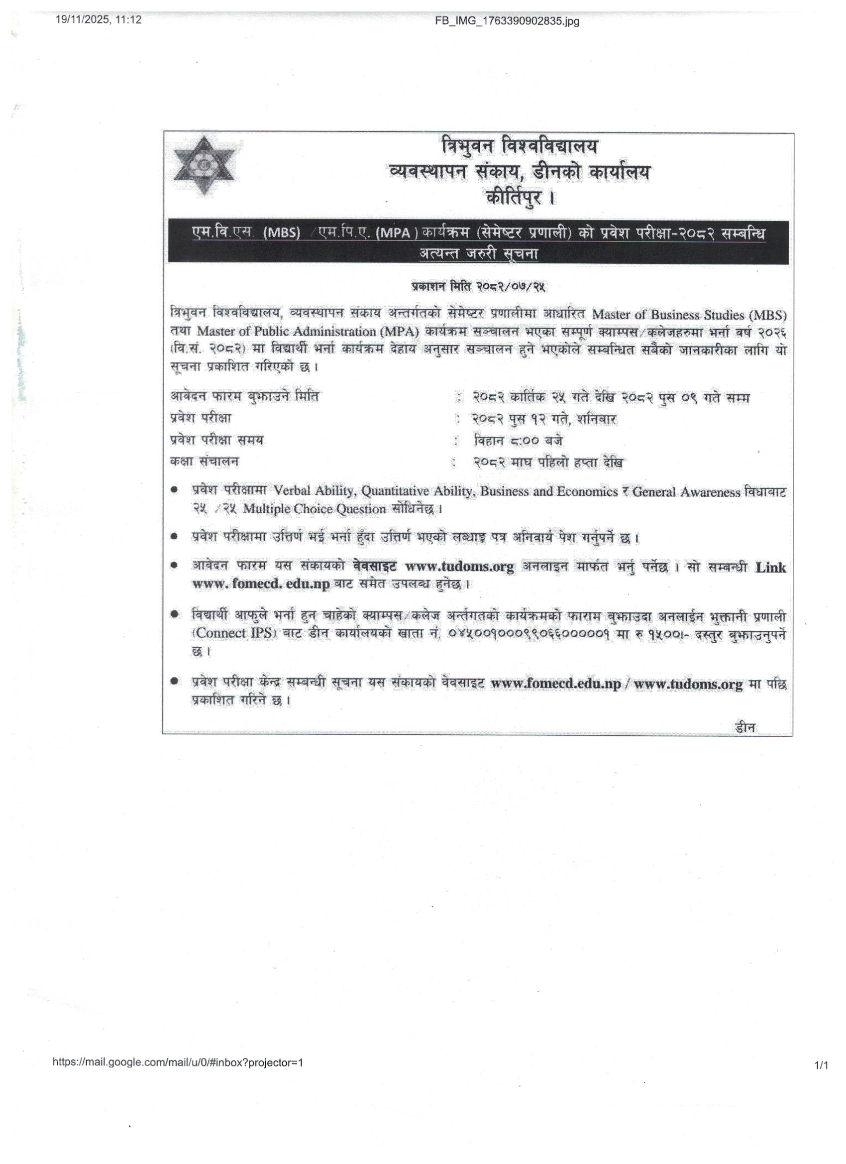 MBS Entrance Exam Form Notice